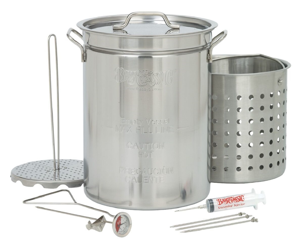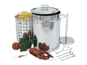 Shop for Stock Pots & Slow Cookers from GrillsDirect.com! Cook turkeys in 45 minutes three chickens in just 20 minutes cook - oh your options are endless with the Bayou Classic 32-Quart Stainless Steel Turkey Fryer Pot Set. Its tall narrow shape means you can cook up to a 22-pound turkey using only 3-5 gallons of oil and it will be ready-to-eat in only 45 minutes! Plus it's faster and more moist than with old-school baking. The kit's skewers let you cook three small chickens at once. With the included perforated basket and poultry rack you .. Read more info click!