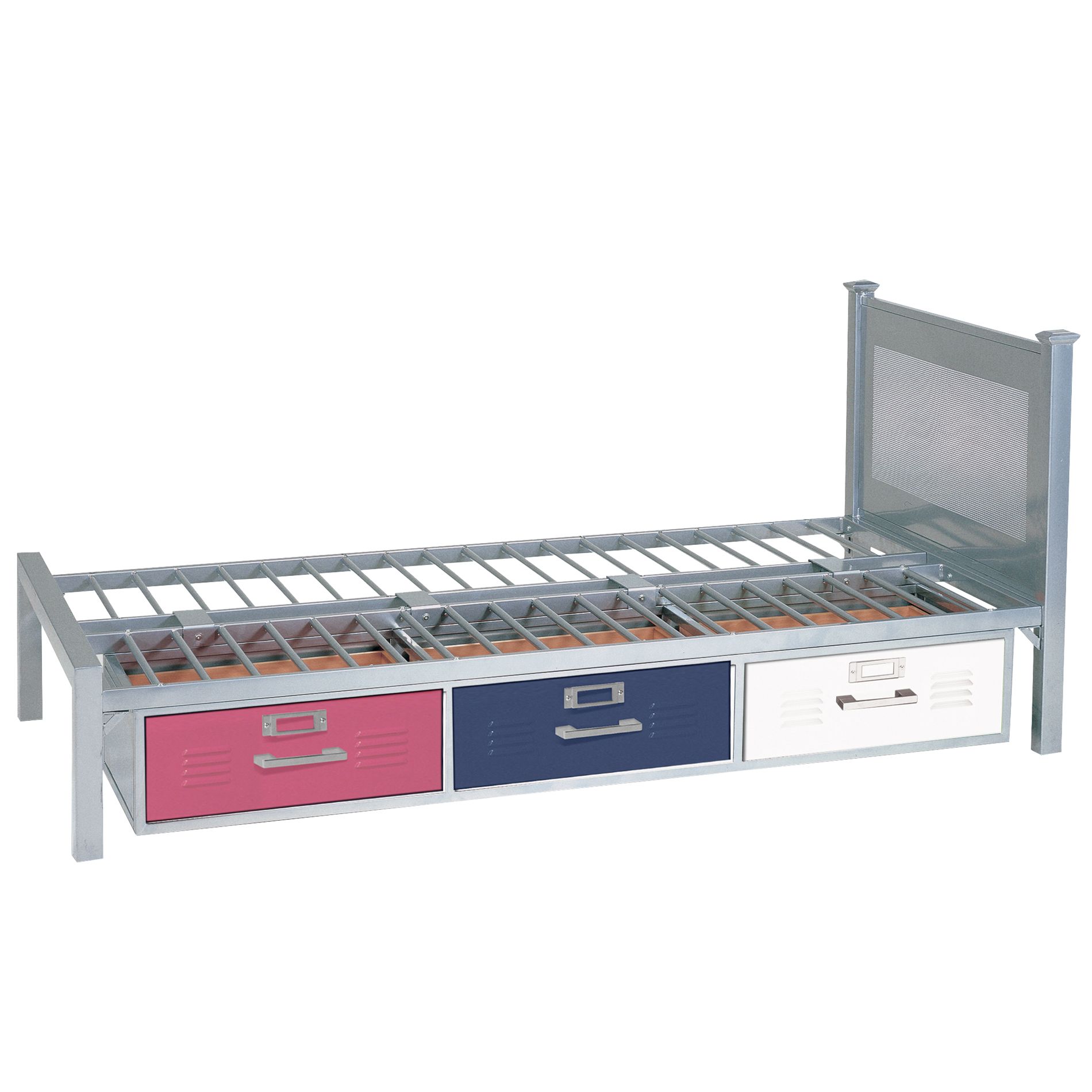 You don't have to push the mess under your bed, when you have a storage friendly Locker Twin Bed. This durable silver metal bed frame features three drawer spaces and a stylishly meshed metal headboard. The frame comes with five colors of drawer panels, so you can mix, match and modify. The Locker Furniture Collection creates a colorful and fun room style for kids and teens to enjoy. 356701997 Features: Durable silver metal frame Stylish mesh metal headboard Includes 5 Locker panel drawer faces in different colors: Royal Blue, White, Red, Orang..