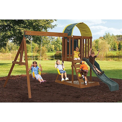 Perfect for areas with limited space the Andorra play set by Big Backyard is a smaller play set that delivers big on fun. Although smaller in size the Andorra does not compromise when it comes to play features and includes some features commonly found on larger play sets ensuring your kids will enjoy countless hours of enjoyment. The Andorra comes complete with:. - 2 classic belt swings. - High rail wavy slide. - Multi-colored rock wall. - Reinforced vinyl chalk wall. - Lower sandbox area. In addition to the impressive play feature list the And.. Read more info click!